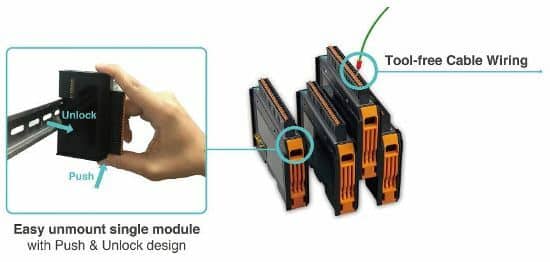 De enkelte ledninger til I/O forbindelserne er uden skruer, ledningerne presses let ned i stikkene uden brug af værktøj. Denne fremgangsmåde sparer tid når enhederne monteres, det sker let og hurtig og forbindelserne er stabile selv hvis installationen sidder et sted med rystelser.