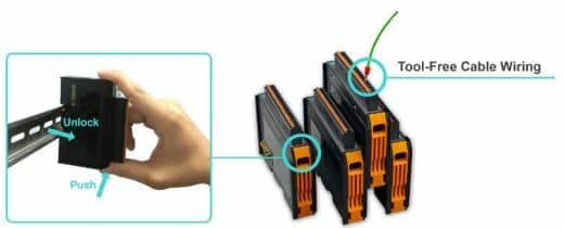 IoThinx 4500-serien har et unikt mekanisk design, der reducerer den tid, der kræves til installation og evt. senere service. Faktisk er skruetrækkere og andet værktøj ikke nødvendigt til nogen del af hardwareinstallationen, herunder montering af enheden på en DIN-skinne, samt tilslutning af ledninger til både kommunikation og I/O.