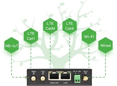 Med IR302 har du flere muligheder for at vælge den eller de netværksforbindelser du har brug for. Fra den kablede 100Mbit forbindelse, den hurtige mobilforbindelse LTE CAT4 og mellemhurtige og langsommere CAT1, CATM, NB-IoT og alternativt også WiFi. Alt dette gør det nemt at få forbindelse til din enhed.
